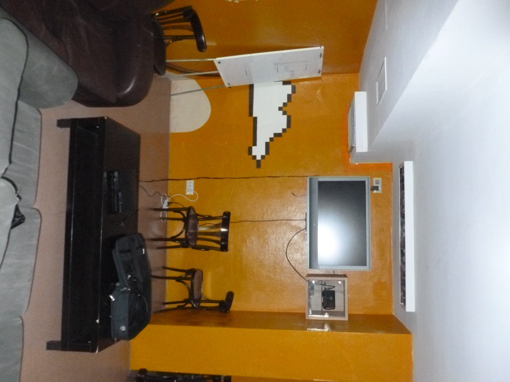 Salle comportant une télévision avec Nintendo Wii, un DVD et des jeux de société