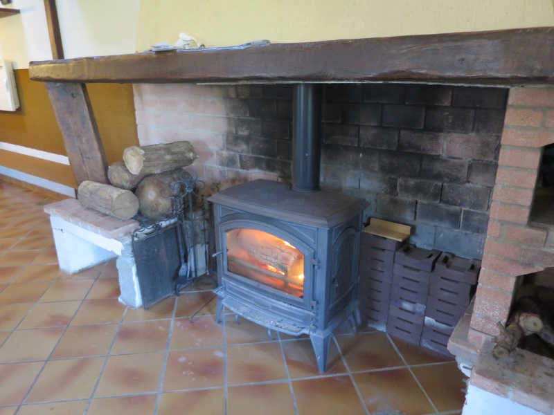 Pièce avec tables, fauteuils, chaises et poêle à bois.