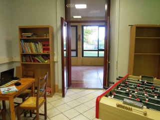 Cette salle est équipée de fauteuils, d’un ordinateur, d’une bibliothèque et d’un babyfoot