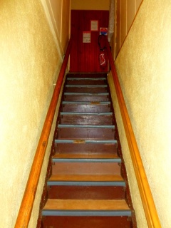 Escalier de secours : Escalier étroit en bois, marches non pleines