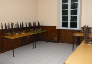 Elle possède un tableau, des tables, chaises et un micro-onde