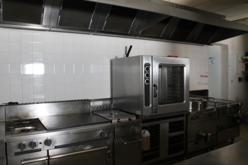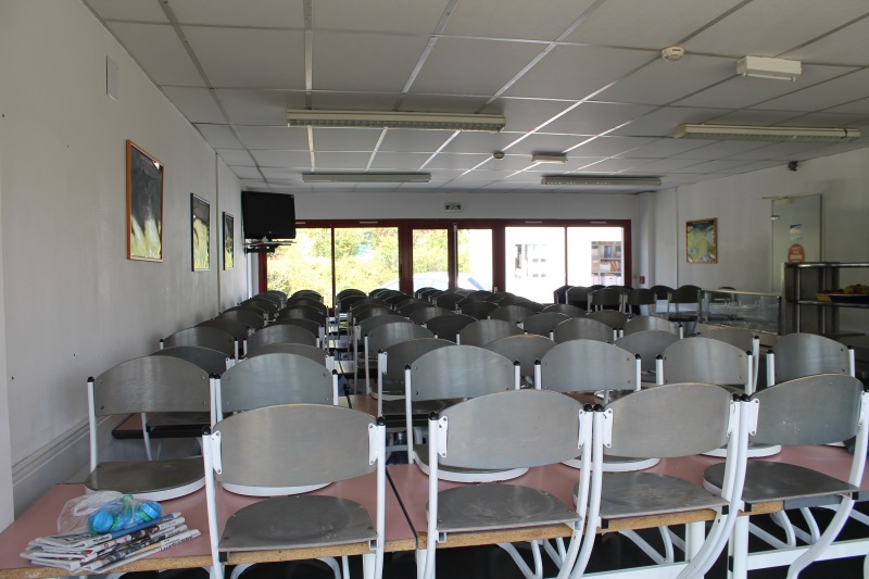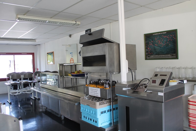 La salle à manger comprend des tables, chaises, d’un self-service ainsi que d’une TV.