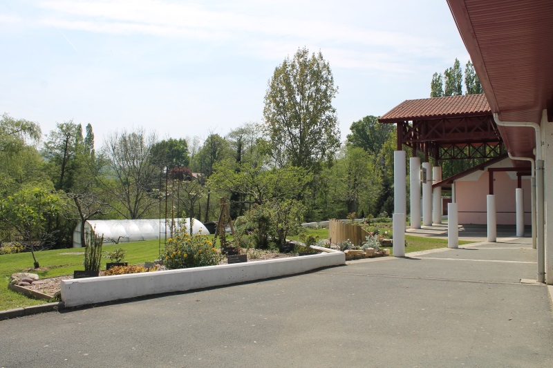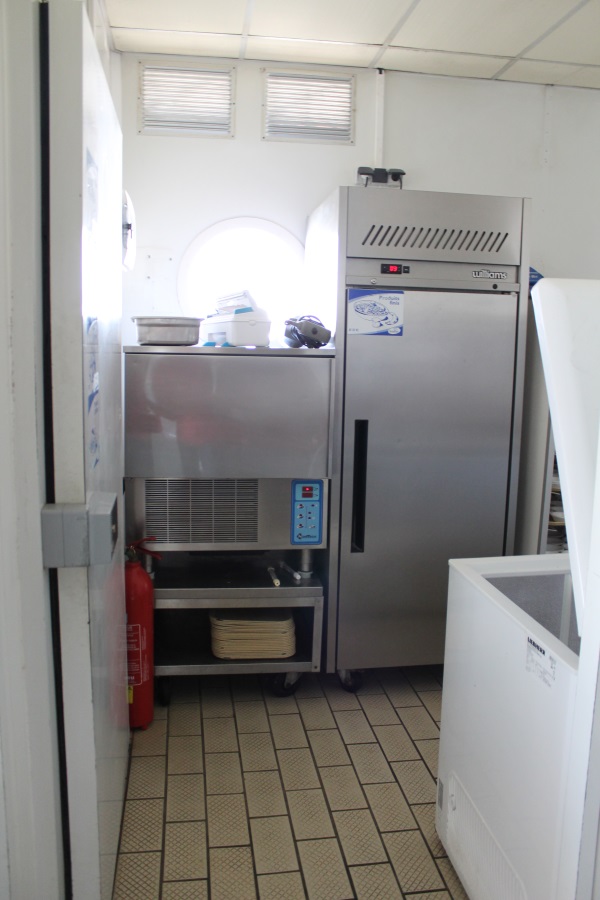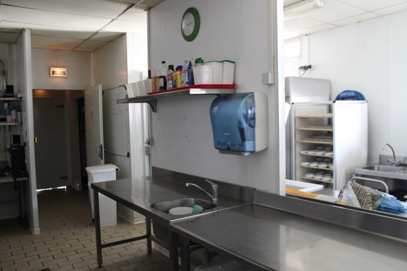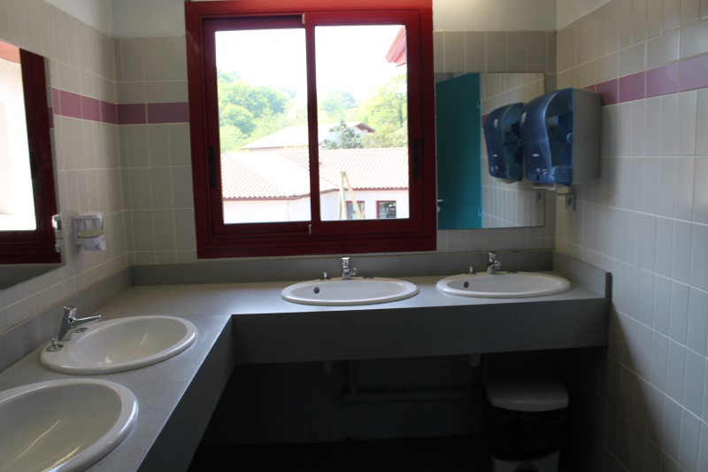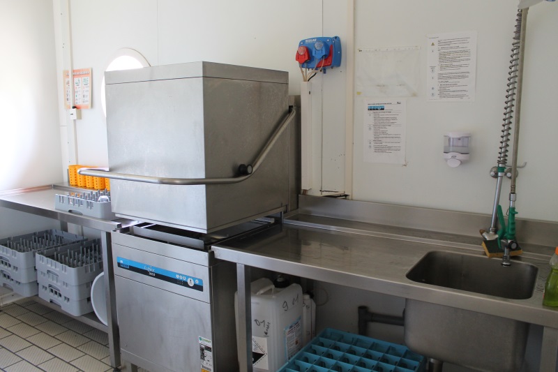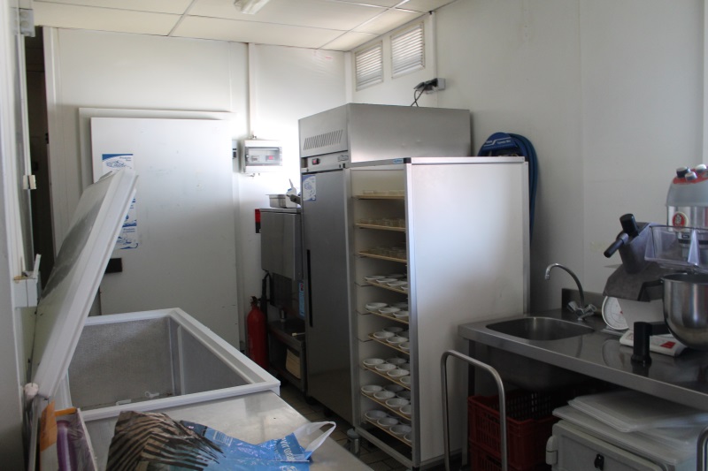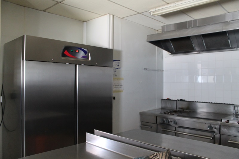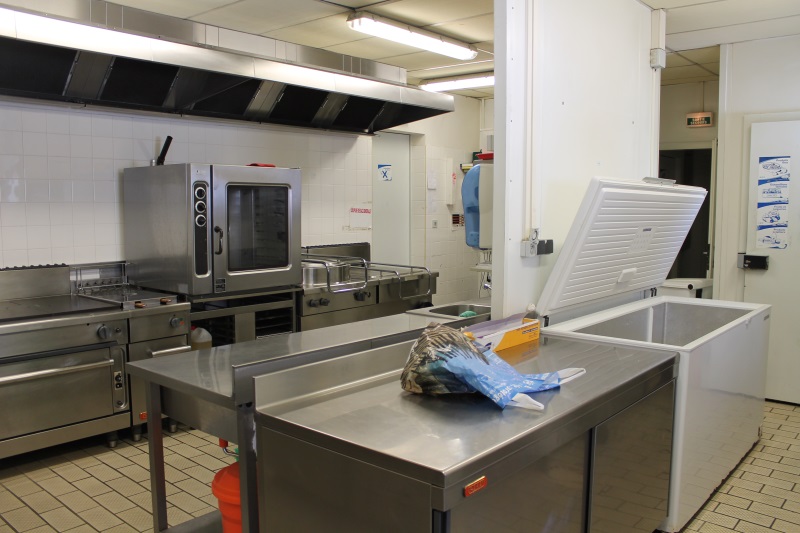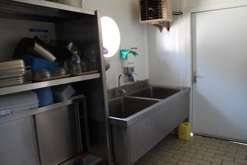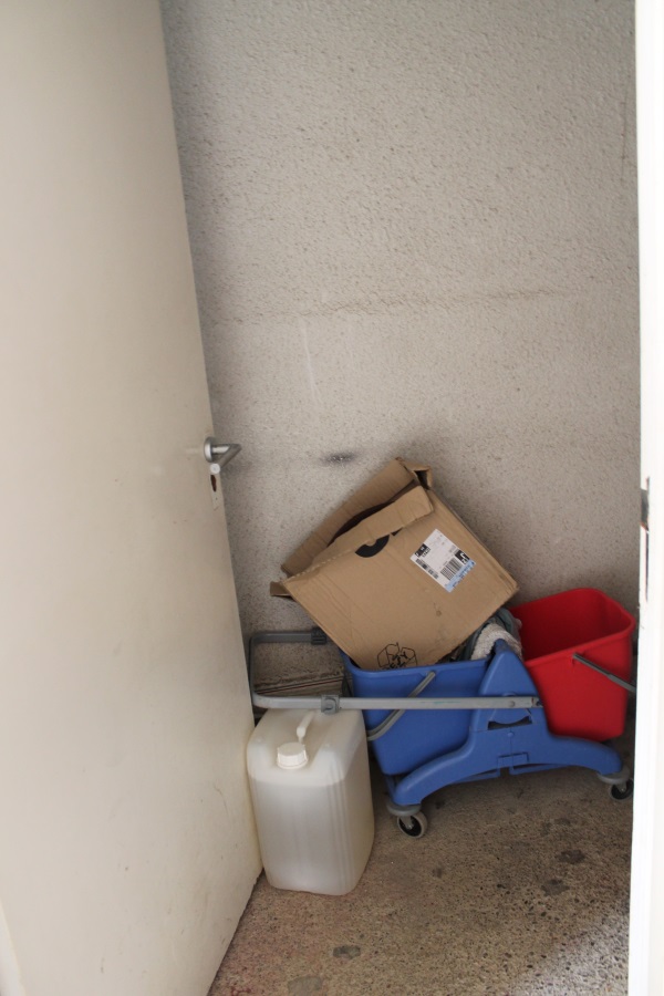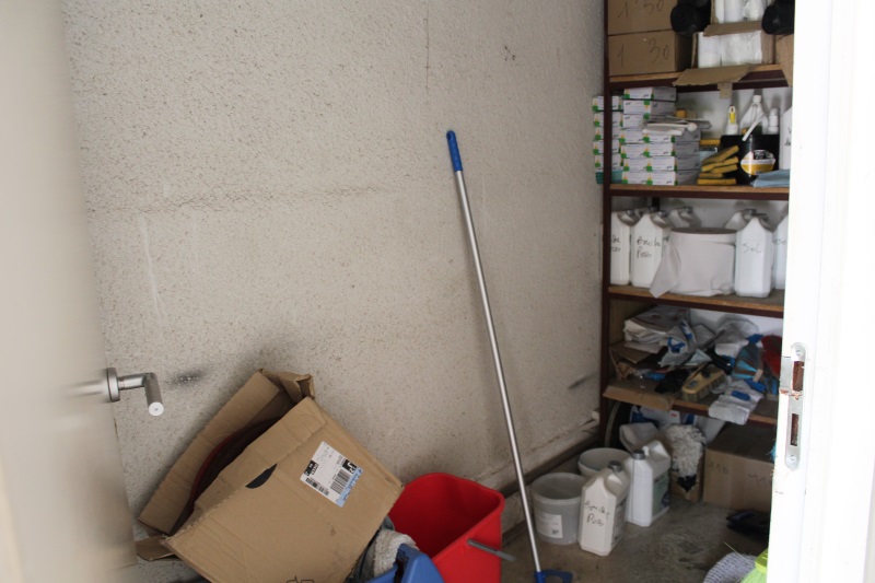 Stockage dans la salle des produits d’entretien (bâtiment extérieur, côté cuisine).