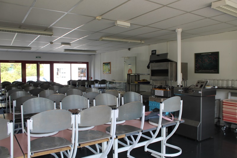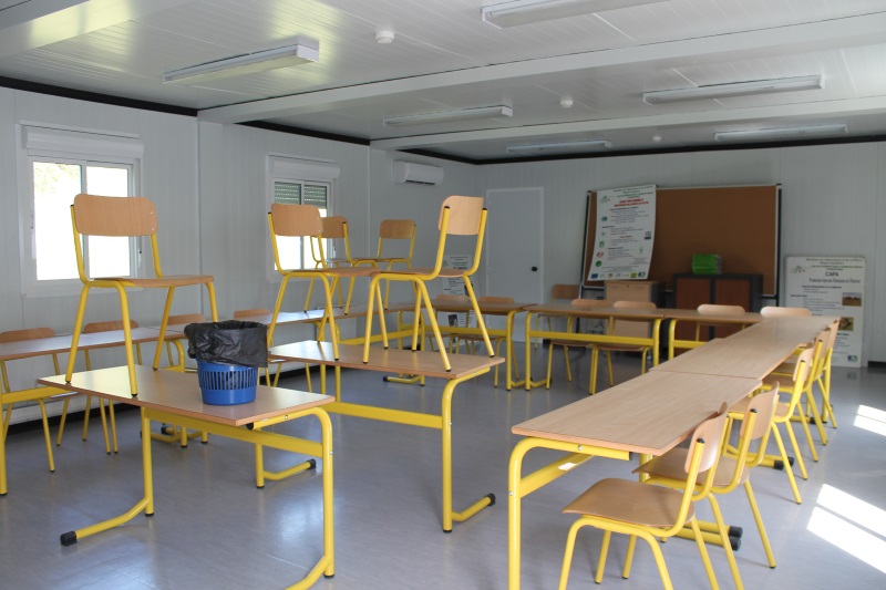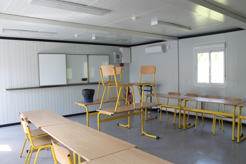 La salle de réunion se situe dans un bâtiment préfabriqué. Elle dispose de tables, chaises, d’un tableau blanc ainsi que de la climatisation.