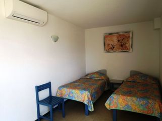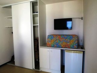 Studios climatisés avec baie vitrée et balcon donnant sur la placette du village avec vue sur mer pour certains avec coin salon, réfrigérateur et TV.