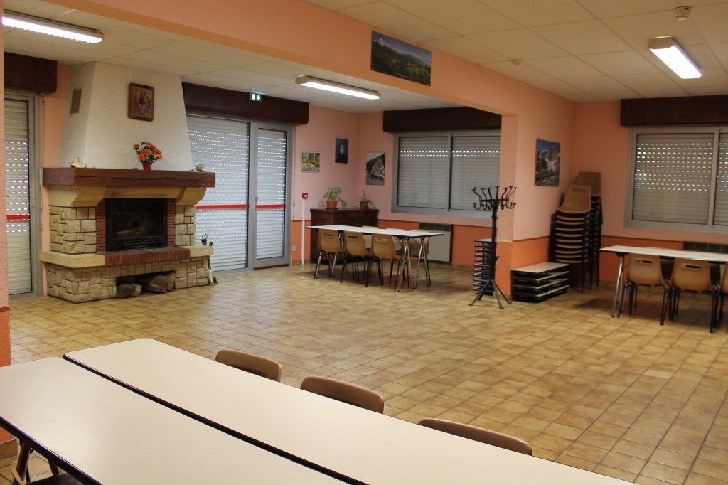 La salle d’activité comprend des tables, des chaises et une cheminée.