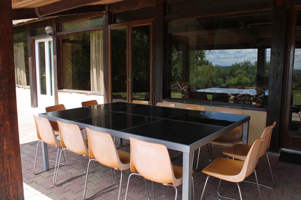 La salle à manger comprend des tables, 9 chaises, 4 fauteuils et 1 canapé.